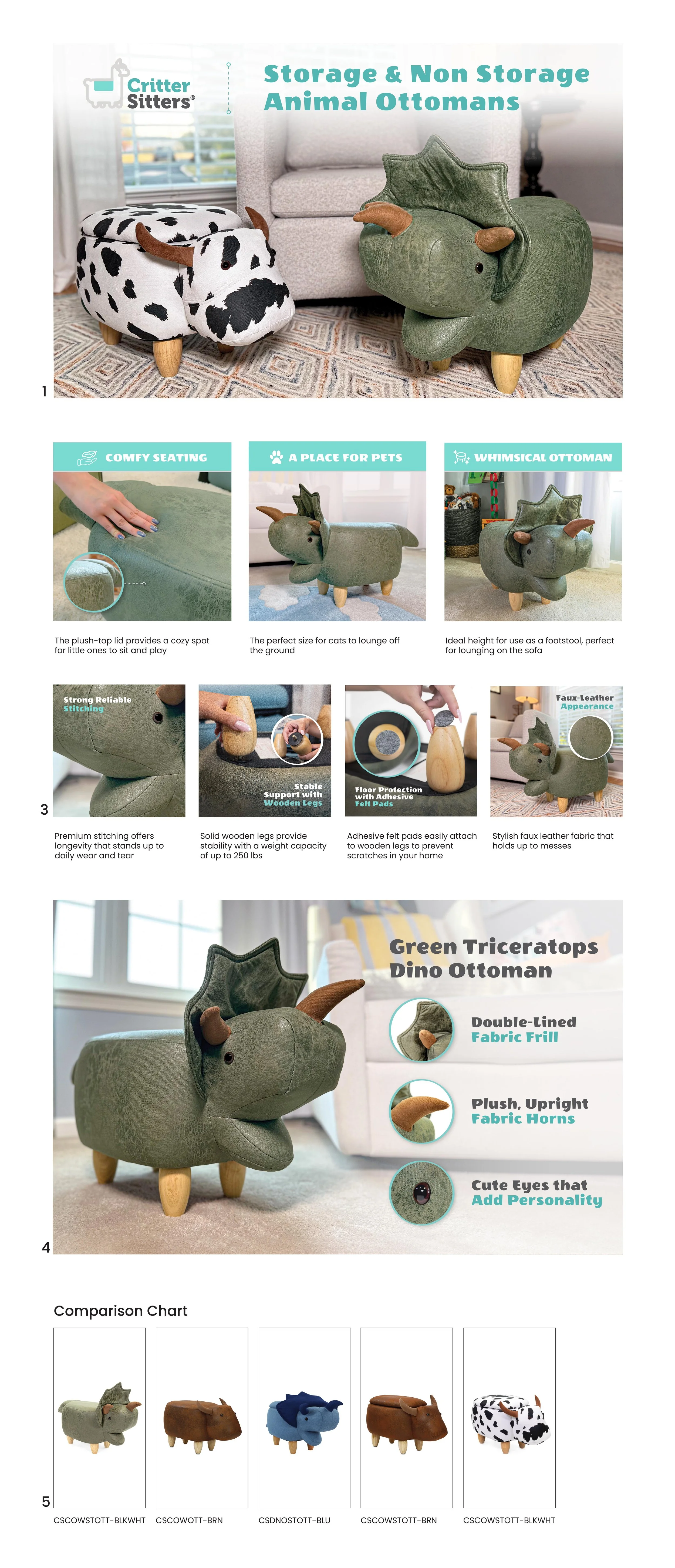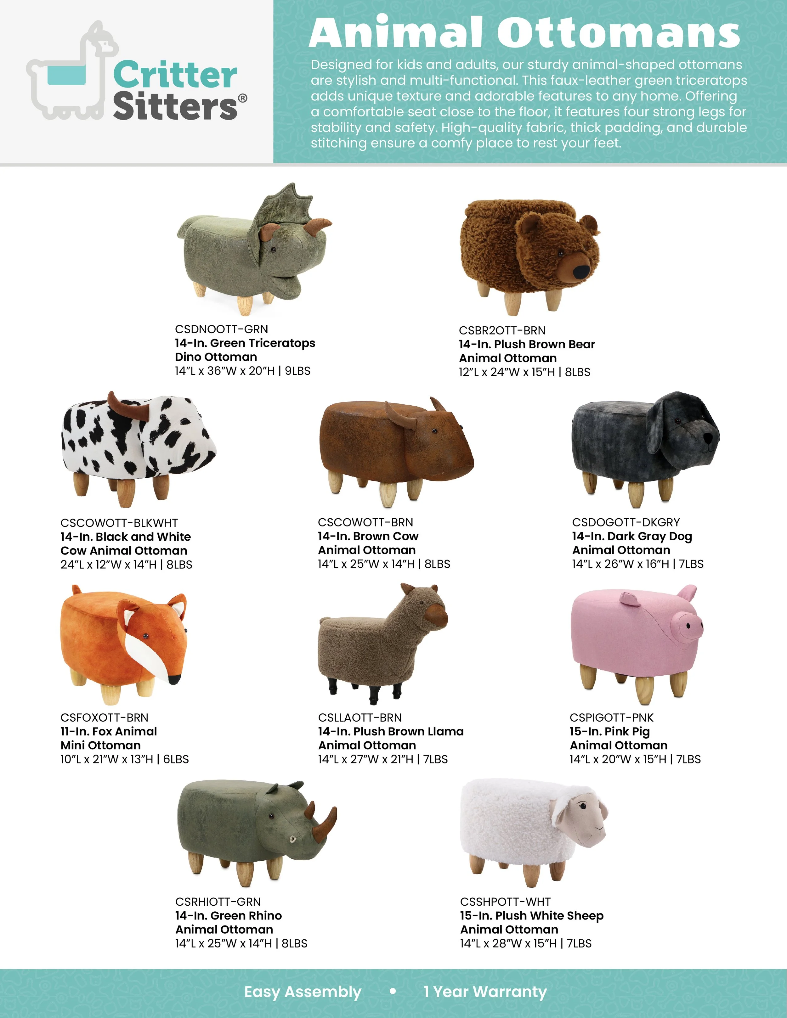 During my internship at Almo Corporation—a leading distributor of major appliances, consumer electronics, and premium home goods—I had the opportunity to work on a variety of e-commerce design projects, from Amazon A+ content to product photography and enhanced images. For my capstone project, I was tasked with leading the design rebrand for Critter Sitters ottoman line, one of Almo’s distributed brands known for its whimsical line of children’s and pet furniture.